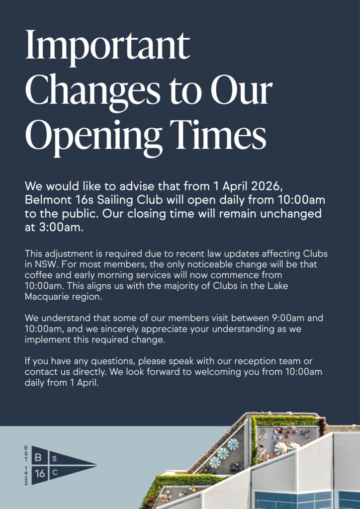 We would like to advise that from 1 April 2026, Belmont 16s Sailing Club will open daily to the Public from 10:00am.